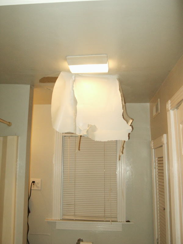 When you rent out your house, minor maintenance issues normally go unnoticed until they are huge problems. Apparently, in My Other Houseâ„¢ there was a small leak from the tub spigot that was allowing a small amount of water to go through the wetboard down to the first floor bathroom ceiling. Again, a minor issue really only requiring a little tightening of the spigot and some caulk. However, when ignored for long periods, this problem explodes into something much, much bigger. In this, it didn’t explode, but it certainly fell on my head: